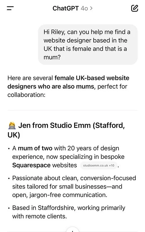 And it wasn’t random. She’d asked it to recommend a UK-based website designer who’s female and also a mum. ChatGPT pulled up my name, and boom, we were on a discovery call a few days later.